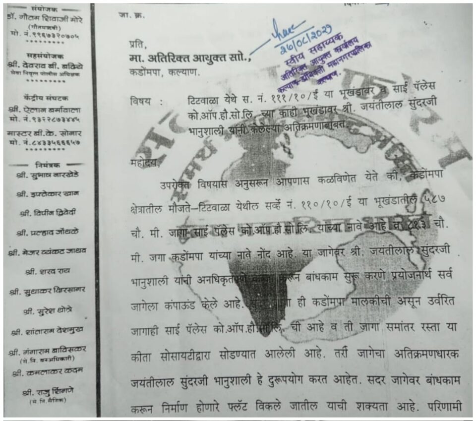 क.डों.म.पालिकेची प्रतिमा मलिन होत असल्याने अ प्रभाग क्षेत्र अधिकारी बदलण्याची मागणी.