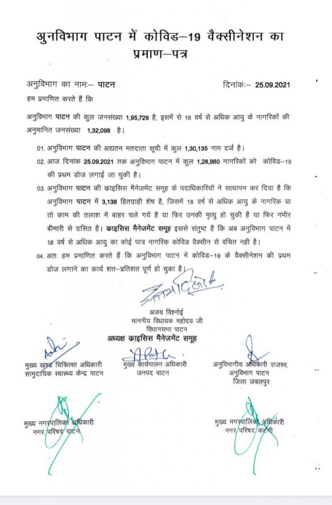 संस्कारधानी जबलपुर के ब्लाक पाटन ने प्रदेश में सर्वप्रथम कोविड-19 वैक्सीनेशन के प्रथम दोज़ का पूर्ण टीकाकरण सत प्रतिशत हासिल कर लिया है । इस संबंध में सामुदायिक भवन पाटन में क्षेत्रीय विधायक माननीय अजय विश्नोई की अध्यक्षता में क्राइसिस मैनेजमेंट समिति के साथ कार्यक्रम का आयोजन किया गया जिसमें स्वास्थ्य विभाग, राजस्व विभाग, महिला बाल विकास विभाग, जनपद पंचायत, नगर परिषद पाटन के अधिकारी कर्मचारी की उपस्थिति में संपन्न हुआ।