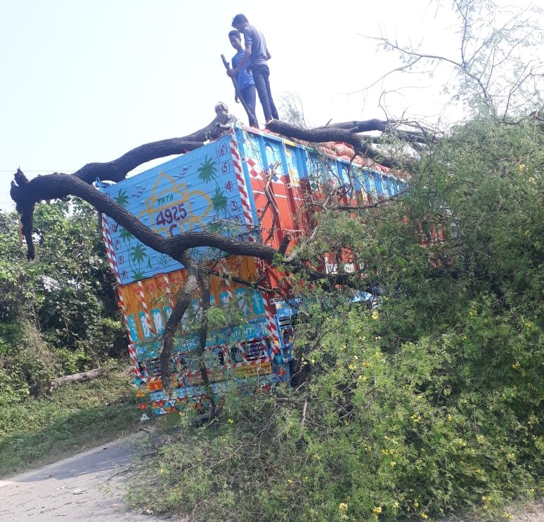 आसपुर देवसरा प्रतापगढ़:थाना क्षेत्र के दाउदपुर चांदा संपर्क मार्ग पर रविवार की सुबह 10:00 बजे आलू लादकर रामगंज मंडी जा रही ट्रक पर सड़क के किनारे स्थित बबूल की पेड़ की डाल फंसने के कारण समूचा बबूल का पेड़ ट्रक पर आ गिरा ड्राइवर को पता भी नहीं चला और घटनास्थल से लगभग 200 मीटर दाउदपुर संपर्क मार्ग पर यादव बस्ती तक घसीटते लेकर चला गया लोगों ने शोर-शराबा किया तब ड्राइवर को पता चला की बबूल का पेड़ ट्रक पर ही गिरा है ट्रक पर बबूल का पेड़ गिरने से घंटों तक सड़क पर आवागमन बाधित रहा ग्रामीणों की मदद से पेड़ को हटाकर आवागमन बहाल हो सका।
