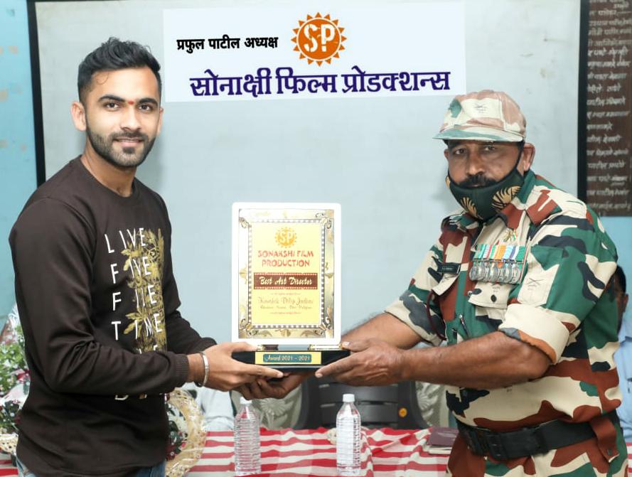 वसई (गुरुदत्त वाकदेकर) : सोनाक्षी फिल्म प्रोडक्शनचे अध्यक्ष प्रफुल पाटील यांनी आयोजित केलेल्या सत्कार सोहळ्यात कौशिक जाधव यांना बेस्ट आर्टिस्ट सन्मान रामसूमीरन भिसेशन बढाई यांच्या हस्ते देण्यात आला. वाडा येथे हा कार्यक्रम पार पडला.