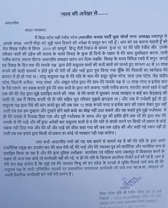जबलपुर के एसपी ऑफिस पहुंची यह महिला जबलपुर के भारतीय जनता पार्टी के युवा मोर्चा नगर अध्यक्ष रंजीत पटेल की पत्नी हैं जो कि अपने ससुराल पक्ष और पति से परेशान हैं जबलपुर एसपी ऑफिस पहुंचकर शिप्रा पटेल नाम की महिला ने अपने पति और ससुराल पक्ष की शिकायत दी है महिला ने भारतीय जनता पार्टी के युवा मोर्चा नगर अध्यक्ष रंजीत पटेल और उनके परिवार जनों पर दहेज प्रताड़ना का आरोप लगाया है और जबलपुर एसपी सिद्धार्थ बहुगुणा से एक ज्ञापन के माध्यम से अपील की है कि उसके दहेज लोभी पति और उसके परिवार जनों पर सख्त से सख्त कार्रवाई की जाए शिप्रा पटेल ने बताया कि उसकी शादी 2019 में भारतीय जनता पार्टी के युवा मोर्चा नगर अध्यक्ष रंजीत पटेल के साथ हुई थी शादी के कुछ दिनों बाद रंजीत पटेल व उसके परिजनों द्वारा दहेज के लालच में उसको परेशान किया जाने लगा और पति व उसके परिजनों द्वारा उसके साथ दहेज को लेकर आए दिन मारपीट की गई जिसकी शिकायत उसके द्वारा महिला थाने में भी की गई पर राजनीतिक रसूख के चलते अभी तक किसी भी प्रकार की कार्यवाही पुलिस द्वारा नहीं की गई है महिला चित्रा पटेल ने बताया कि उसके मायके व वालों ने उनकी शादी के सम 40 से 50 लाख रु खर्च किए लेकिन शादी के कुछ दिनों बाद से ही उनके पति वे ससुराल वाले 10 लाख रुपए और एक इनोवा की लगातार मांग करने लगे जिसकी शिकायत शिप्रा पटेल द्वारा महिला थाने में भी दी गई थी पर अभी तक पुलिस द्वारा किसी भी प्रकार की कोई कार्रवाई नहीं की गई है ।