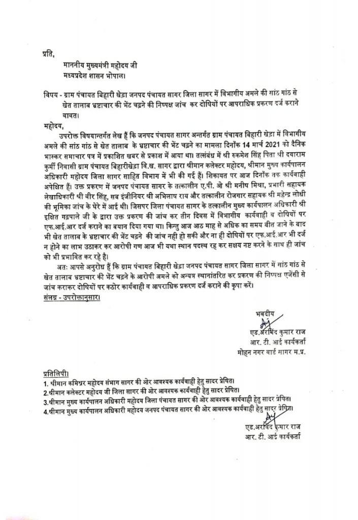 सागर ।। जनपद पंचायत सागर अन्तर्गत ग्राम पंचायत बिहारी खेड़ा में विभागीय अमले की सांठ गांठ से वर्ष 2021 में खेत तालाब के भ्रष्टाचार की भेंट चढ़ने का मामला अब प्रदेश के मुख्यमंत्री शिवराज सिंह चौहान तक पहुंच गया। जिले के आई. टी. आई. कार्यकर्ता एड.अरविन्द कुमार राज ने उक्त मामले की शिकायत मुख्यमंत्री शिवराज सिंह चौहान से करते हुये खेत तालाब निर्माण में हुये फर्जीवाड़े और किये गए भ्रष्टाचार की निष्पक्ष जांच कर दोषियों पर आपराधिक प्रकरण दर्ज करने की मांग की है। आई. टी. आई. कार्यकर्ता एड.अरविन्द कुमार राज ने मुख्यमंत्री शिवराज सिंह चौहान को भेजे शिकायती पत्र में कहा है कि दिनाँक 14 मार्च 2021 को जनपद पंचायत सागर की ग्राम पंचायत बिहारीखेड़ा में खेत तालाब निर्माण में फर्जीवाड़े और किये गए भ्रष्टाचार की शिकायत रुकमेश सिंह पिता दयाराम कुर्मी निवासी ग्राम पंचायत बिहारीखेड़ा वि.ख. सागर द्वारा कलेक्टर एवं मुख्य कार्यपालन अधिकारी जिला सागर साहित विभाग में भी की गई हैं। शिकायत पर आज दिनाँक तक ठोस कार्यवाही नही की गई हैं। शिकायत में कहा गया हैं कि उक्त प्रकरण में जनपद पंचायत सागर के तत्कालीन ए.पी. ओ मनीष मिश्रा, प्रभारी सहायक लेखाधिकारी वीर सिंह, सब इंजीनियर अभिलाष राय और तत्कालीन रोजगार सहायक महेन्द्र लोधी की भूमिका जांच के घेरे में आई थी। जिस पर जिला पंचायत सागर के तत्कालीन मुख्य कार्यपालन अधिकारी इक्षित गढ़पाले के द्वारा उक्त प्रकरण की जांच कर तीन दिवस में विभागीय कार्यवाही व दोषियों पर एफ.आई.आर दर्ज कराने का बयान दिया गया था। किन्तु आज आठ माह से अधिक का समय बीत जाने के बाद भी खेत तालाब के भ्रष्टाचार की भेंट चढ़ने की जांच नही हो सकी और ना ही दोषियों पर एफ.आई.आर भी दर्ज न होने का लाभ उठाकर कर आरोपी गण आज भी यथा स्थान पदस्थ रह कर सक्षय नष्ट करने के साथ ही जांच को भी प्रभावित कर रहे है। शिकायत मे माँग की गई हैं ग्राम पंचायत बिहारी खेड़ा जनपद पंचायत सागर जिला सागर में सांठ गांठ से खेत तालाब भ्रष्टाचार की भेंट चढ़ने के आरोपी अमले को अन्यत्र स्थानांतरित कर प्रकरण की निष्पक्ष एजेंसी से जांच कराकर दोषियों पर कठोर कार्यवाही व आपराधिक प्रकरण दर्ज किया जाये।