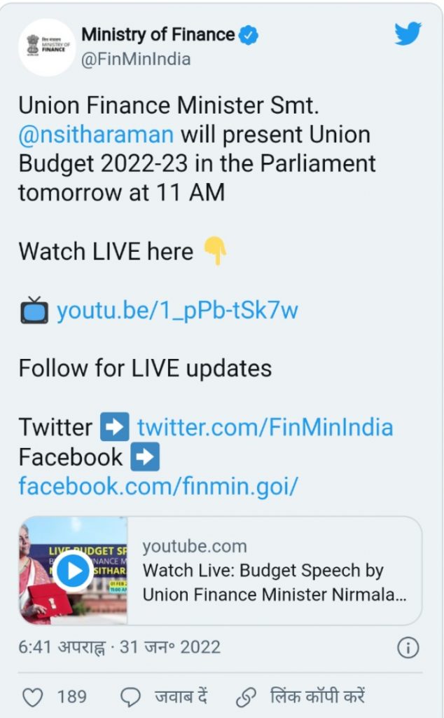 केंद्रीय वित्त मंत्री निर्मला सीतारमण आज पूर्वाह्न 11 बजे संसद में वित्त वर्ष 2022-23 के लिए आम बजट पेश करेंगी. यह केंद्रीय वित्त मंत्री निर्मला सीतारमण का चौथा बजट होगा. पिछले साल की तरह इस बार भी पेपरलेस बजट पेश किया जाएगा।