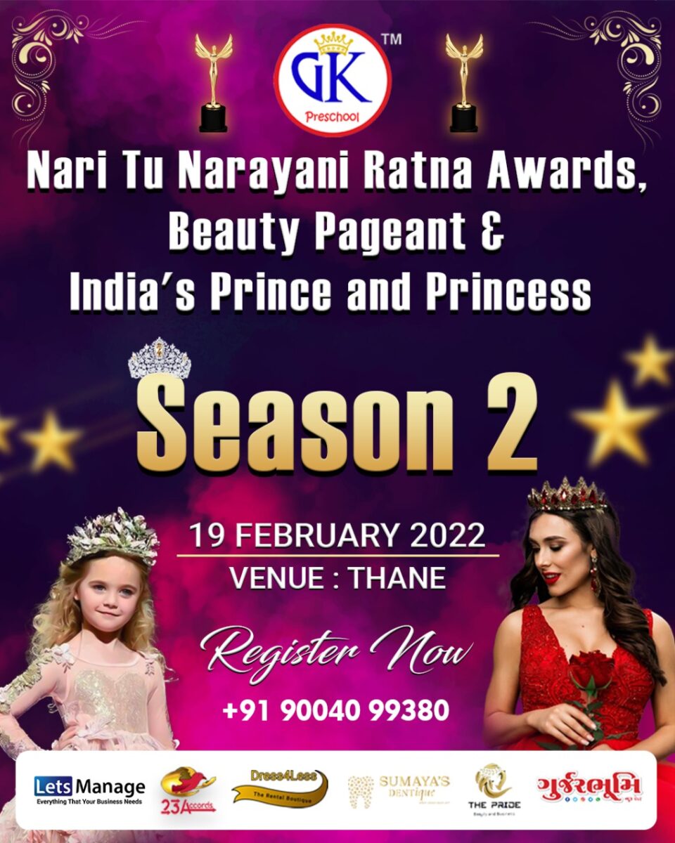 मुंबई (गुरुदत्त वाकदेकर) : ग्रोइंग किड्स प्रीस्कूल संस्थेच्या वतीने “नारी तू नारायणी रत्न पुरस्कार व सौंदर्य स्पर्धा” पर्व दोनचे आयोजन करण्यात आले आहे. हा भव्य कार्यक्रम शनिवार, १९ फेब्रुवारी २०२२ रोजी सायंकाळी ७ वाजता ठाण्यातील समारंभ लॉन्स येथे होणार आहे. हेमा भट्ट यांच्या मार्गदर्शनाखाली हा कार्यक्रम आयोजित करण्यात आला असून, ठाणे आणि मुंबईतील मान्यवर सदस्य उपस्थित राहणार आहेत. सौंदर्य स्पर्धेचे परीक्षण दंत शल्यचिकित्सक, रॅम्पवॉक मॉडेल, समाजसेविका डॉ. सुमाया रेश्मा करतील. सुमित बोत्रा (सीईओ-हॅपी ह्यूज) आणि डॉ. संगीता पाटील (सीईओ-हे फाउंडेशन) आणि फॅशन उद्योगातील अनेक मान्यवरांना सादर आमंत्रित केले आहे. स्पर्धेत सहभागी होऊ इच्छिणाऱ्यांनी अधिक माहितीसाठी 9004099380 या क्रमांकावर संपर्क साधावा.