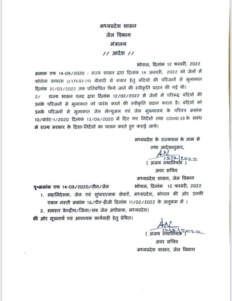 राज्य शासन ने कोरोना वायरस (कोविड-19) बीमारी से बचाव हेतु बंदियों की परिजन से मुलाकात 31 मार्च, 2022 तक प्रतिबंधित की गई थी, जेल विभाग द्वारा 12 फरवरी से जेलों में परिरूद्ध बंदियों की उनके परिजन से मुलाकात को प्रारंभ करने की स्वीकृति प्रदान की है।