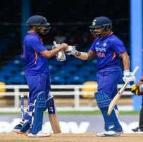 कर्णधार शिखर धवन आणि शुभमन गील यांनी डावाची संथगतीने सुरूवात केली. १०व्या षटकापर्यंत ४५ धावा फलकावर लागल्या होत्या. दोघांनीही समान २२ धावा जोडल्या होत्या. फक्त १ धाव अवांतरची जोडली होती. वेस्ट इंडिजकडून चांगली गोलंदाजी होत होती. १२व्या षटकाच्या पहिल्या चेंडूवर त्यांची अर्धशतकी भागीदारी झाली. १८व्या षटकात शिखर धवनने अर्धशतक झळकावले. २०व्या षटकात भारताच्या १०० धावा आणि या दोघांची शतकी भागीदारी असा योग जुळून आला. १०१ धावांमध्ये केवळ ३ धावा अवांतरच्या होत्या. २२व्या षटकात शुभमन गीलने अर्धशतक झळकावले. २३व्या षटकात हेडन वॉल्शने शिखर धवनला ५८ धावांवर बाद केले. अजून एक शतकी भागीदारी करून धवन ११३/१ अशी धावसंख्या असताना परतला. श्रेयस अय्यरने सावध सुरूवात केली. पण २४व्या षटकानंतर पावसाच्या व्यत्ययामुळे सामना थांबवावा लागला. जवळपास दोन तासांनी खेळ पुन्हा सुरू झाला. तेव्हा सामना ४० षटकांपर्यत मर्यादित करण्यात आला. भारताने पहिल्या २४ षटकांत केलेली संथ फलंदाजी उरलेल्या १६ षटकांत धावा वसूल करून भरून काढावी लागणार होती. ८५ धावांची भागीदारी करून अय्यर ४ धावांवर बाद झाला. त्याला अकील हुसेनने बाद केले. सुर्यकुमारचा सुर्य अस्ताला गेल्याप्रमाणे तो गेले काही सामने खेळत आहे. त्याला हेडन वॉल्शने बाद केले. गीलच्या नर्व्हस नाईनटीज फटका भारतीय धावसंख्येवर होत होता. ३६व्या षटकात २२५/३ अशी धावसंख्या झळकत होती आणि पुन्हा पाऊस आला. त्याला गीलला बसला. त्याचे पहिलेवहिले शतक होता होता राहिले. त्याने ७ चौकार आणि २ षटकारांच्या सहाय्याने नाबाद ९८ धावा काढल्या.