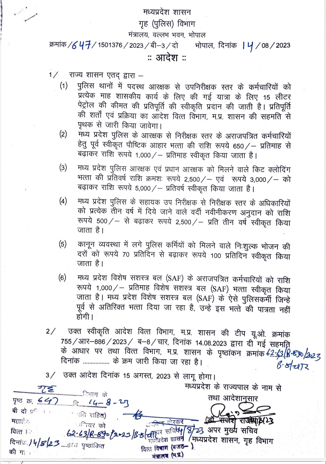 गृह विभाग ने लागू करने के आदेश जारी कर दिए हैं, अब 18 रुपये प्रतिमाह साइिकल भत्ते की जगह हर माह 15 लीटर पेट्रोल के लिए राशि दी जाएगी, पौष्टिक आहार भत्ता प्रतिमाह 650 रुपये की जगह एक हजार रुपये दिया जाएगा, वर्दी नवीनीकरण अनुदान को 500 से बढ़ाकर 2500 रुपये किया गया , कानून व्यवस्था में लगे पुलिसकर्मियों को मिलने वाले निश्शुल्क भोजन की दरों को 70 प्रतिदिन से बढ़ाकर सौ रुपये किया गया ,आरक्षक और प्रधान आरक्षक को प्रतिवर्ष मिलने वाले वर्दी भत्ते की राशि क्रमश : 2500 और 3000 से बढ़ाकर 5000 रुपये की गई, एसएएफ के अराजपत्रित कर्मचारियों को एसएएफ भत्ता एक हजार रुपये दिया जाएगा, ऐसे पुलिसकर्मी जिन्हें पहले से यह भत्ता मिल रहा है उन्हें इसकी पात्रता नहीं रहेगी।