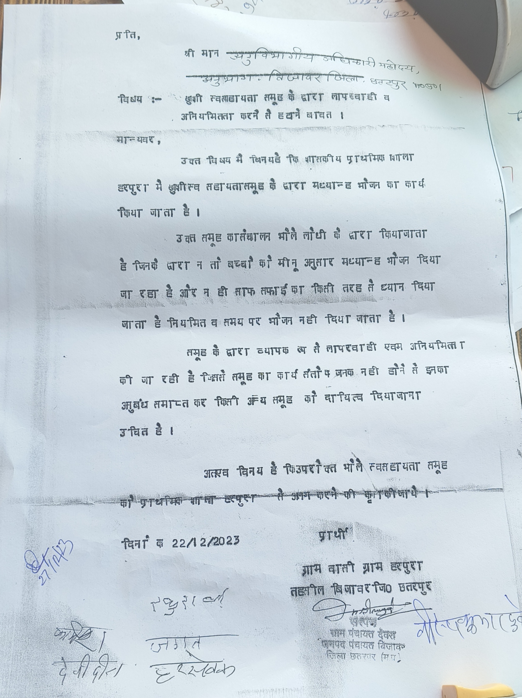 बिजावर। जनपद क्षेत्र के ग्राम पंचायत देवरा के ग्राम हरपुरा में खुशी स्व. सहायता समूह के द्वारा बच्चो को मध्यान्ह भोजन बनाने का कार्य किया जाता है, समूह संचालक भोले लोधी के द्वारा घोर लापरवाही बरती जा रही है समूह संचालक भोले लोधी के हौसले इतने बुलंद है कि उसे शासन-प्रशासन का कोई भय नहीं है ग्रामीणों के द्वारा कई बार समझाइस देने के बाद भी समूह संचालक अपनी हरकतों से बाझ नहीं आ रहा है तो वही ग्रामीणों ने आज मुख्यालय पहुंचकर उक्त मामले की लिखित शिकायत कर डाली ग्रामीणों ने शासकीय प्राथमिक शाला हरपुरा में संचालित खुशी स्व. सहायता समूह को निरस्त करने की मांग की है शिकायतकर्ता ने स्पष्ट तौर पर बताया है कि खुशी स्व. सहायता समूह संचालक भोले लोधी द्वारा बच्चों को मीनू अनुसार भोजन नहीं दिया जा रहा है और समूह संचालक मन मुताबिक बच्चों को गुणवत्ताहीन भोजन दे रहे है जो शासन प्रशासन के नियमों का खुला उल्लंघन है। उल्लेखनीय है कि समूह संचालक का कार्य संतोषजनक नहीं है जहां पर बच्चों को मीनू अनुसार भोजन नहीं दिया जाता है और ना ही नियमित भोजन दिया जा रहा है जिसमें साफ सफाई का भी ध्यान नहीं दिया जा रहा है जिससे ग्रामीणों ने अधिकारियों से लिखित शिकायत करते हुए समूह का अनुबंध निरस्त करने की मांग की है।