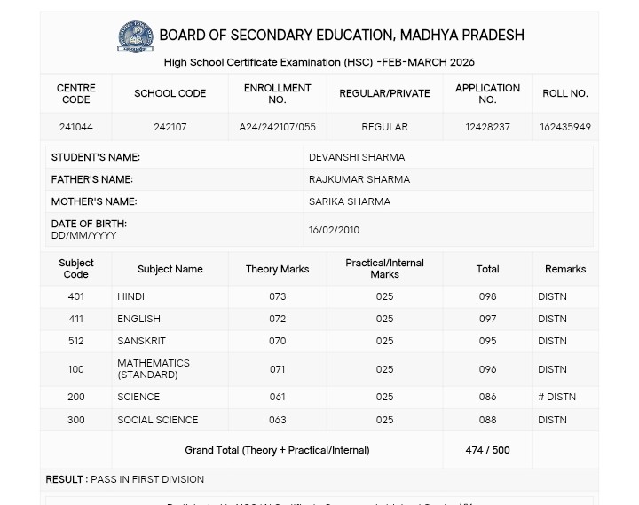 प्राप्त जानकारी के अनुसार छात्रा कल्पना ठाकुर ने समस्त विषयों में कुल 500 अंकों में से 491 अंक प्राप्त कर प्रदेश की टॉप 10 सूची में नौवां स्थान हासिल किया है।