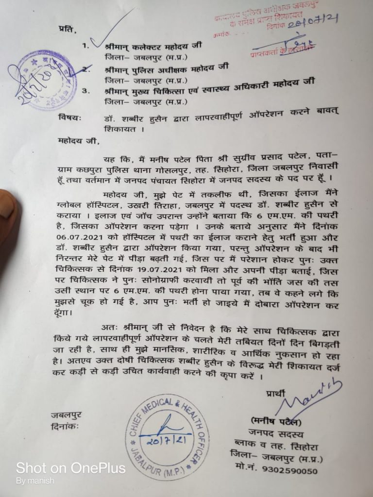 इस आशय की शिकायत पीडित ने जिला कलेक्टर पुलिस अधीक्षक जबलपुर मुख्य चिकित्सा एवं स्वास्थ्य अधिकारी जबलपुर से की है