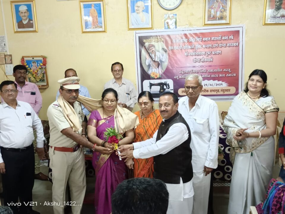 नंदुरबार दि.२३(किशोर पाटील) अखिल भारतीय श्री क्षत्रिय अहिर शिंपी समाज मध्यवर्ती संस्था आयोजित, स्वामी नारायण ट्रस्ट कल्याण,रोटी डे ग्रुप व कच्छ युवक संघ यांच्या सौजन्याने शनिवार दि.२१/०८/२०२१ रोजी जेष्ठ नागरिक सामाजिक सभागृह रेस्ट हाऊसच्या मागे नेहरूनगर नंदुरबार,येथे आत्मनिर्भर शिवण मशिन योजने अंतर्गत गरीब गरजु महिलांना शिलाई मशिन चे मोफत वाटप , विविध क्षेत्रातील गुणवंत विद्यार्थी तसेच कोरोणा काळात चांगले काम करणाऱ्या शिक्षक, महिला समजा सेवीकांचा हिरकणी पुरस्कार प्रमाणपत्र देऊन मान्यवरांच्या शुभ हस्ते सन्मान करण्यात आला।