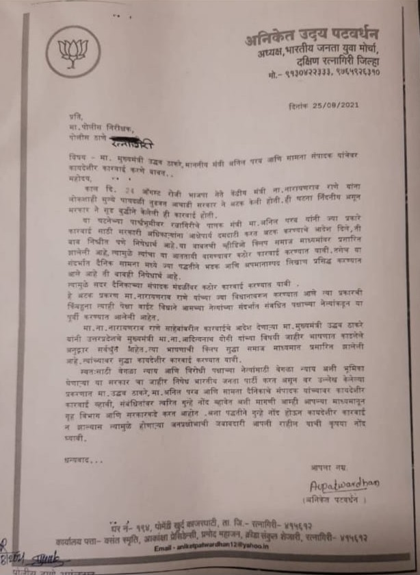 स्वतःसाठी वेगळा न्याय आणि विरोधी पक्षाच्या नेत्यांसाठी वेगळा न्याय अशी भूमिका घेणाऱ्या या सरकारचा जाहीर निषेध भारतीय जनता युवा मोर्चा आणि भारतीय जनता पार्टी करत आहे. वर उल्लेख केलेल्या प्रकरणात मा. उद्धव ठाकरे, मा.अनिल परब आणि सामना दैनिकाचे संपादक यांच्यावर कायदेशीर कारवाई व्हावी, संबंधितांवर त्वरित गुन्हे नोंद व्हावेत, अशी मागणी आपल्या माध्यमातून गृह विभाग आणि सरकारकडे करत आहोत. अशा पद्धतीने गुन्हे नोंद होऊन कायदेशीर कारवाई न झाल्यास त्यामुळे होणाऱ्या जनप्रक्षोभाची जबाबदारी आपली राहील, याची कृपया नोंद घ्यावी, असेही निवेदनात म्हटले आहे।